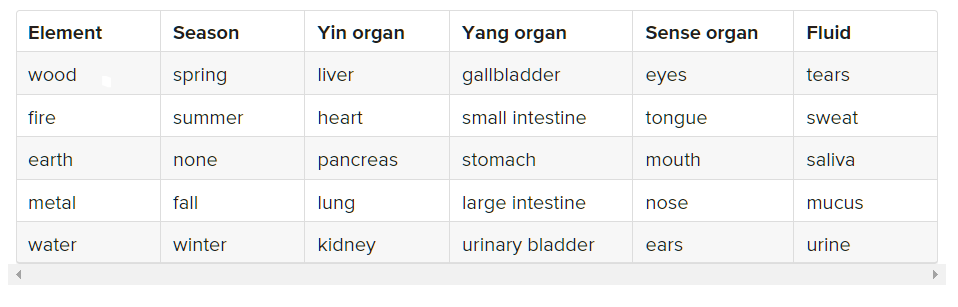 Similarly in Traditional Chinese Medicine (TCM), the Five Elements Theory has - Wood, Fire, Earth, Metal, and Water, as the fundamental elements of everything in the universe between which interactions occur. The five elements are connected to seasons, body organs, senses and fluids. Treatments, diets and exercises can then be prescribed in a more organized manner making maximum use of environmental factors. The table below shows the connections: